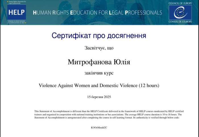 Senior lecturers of the Department of Criminal Law and Criminology of the ERI No. 5, Natalia KOBETS and Yulia MYTROFANOVA, took the course "Violence Against Women and Domestic Violence (12 hours)", organized by the Council of Europe Office in Ukraine within the framework of the HELP program. https://univd.edu.ua/uk/news/23105