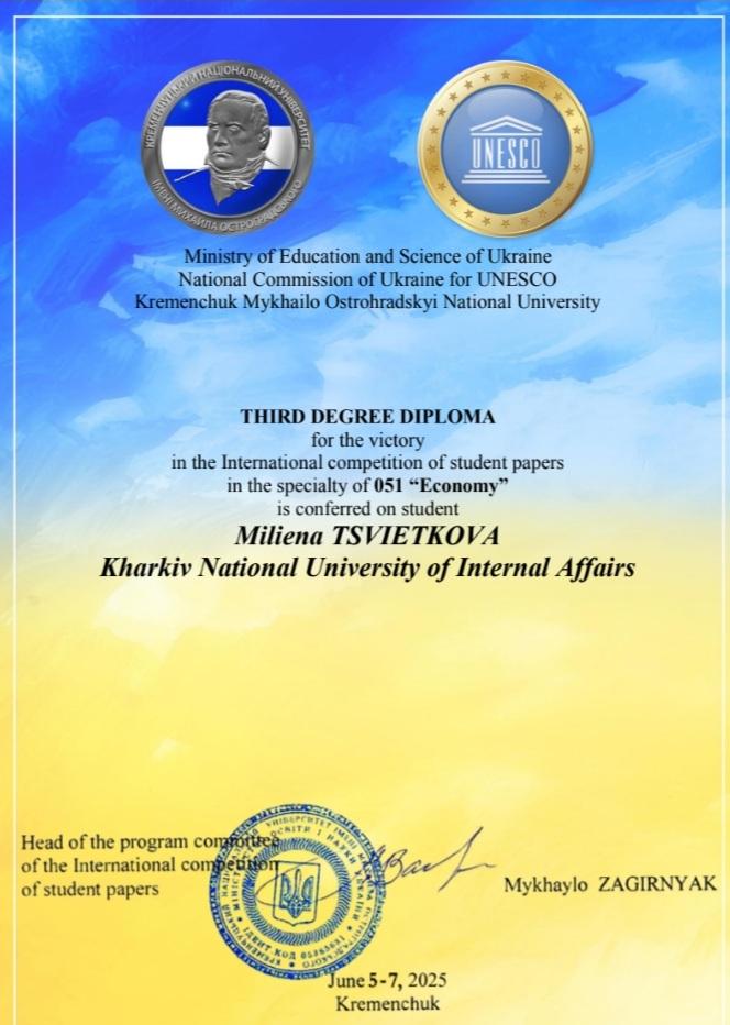 A 2nd year student of the ERI No. 2 Miliena TSVIETKOVA took 3rd place in the International competition of student scientific works. The event was organized by Kremenchuk Mykhailo Ostrohradskyi National University under the patronage of the National Commission of Ukraine for UNESCO. https://univd.edu.ua/uk/news/24254