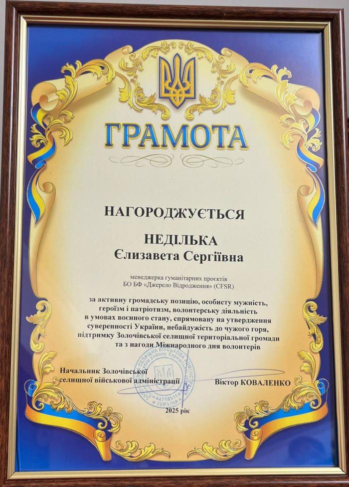 Third-year student of the ERI No.5 Yelyzaveta NEDILKO is the manager of humanitarian projects of the Charitable Organization «Charitable Foundation “Source of Revival”». She takes an active part in measures to help military personnel and persons affected by the enemy aggression of the russian federation.https://univd.edu.ua/uk/news/26052