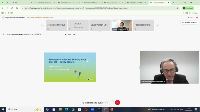 Moderator, Head of Sector Unit I.1 EISMEA Daniel GASSMANN outlined the key tasks of the event. Kateryna NOVIKOVA, Deputy Head of the DG RTD A5 Department, presented the priorities of European innovation policy. Policy officer Cedric ADAM spoke about the support of startups and the content of the pilot competition, and project advisor Nataliia NOVINSKA – about the practical aspects of participation, including the creation of consortia and hubs.