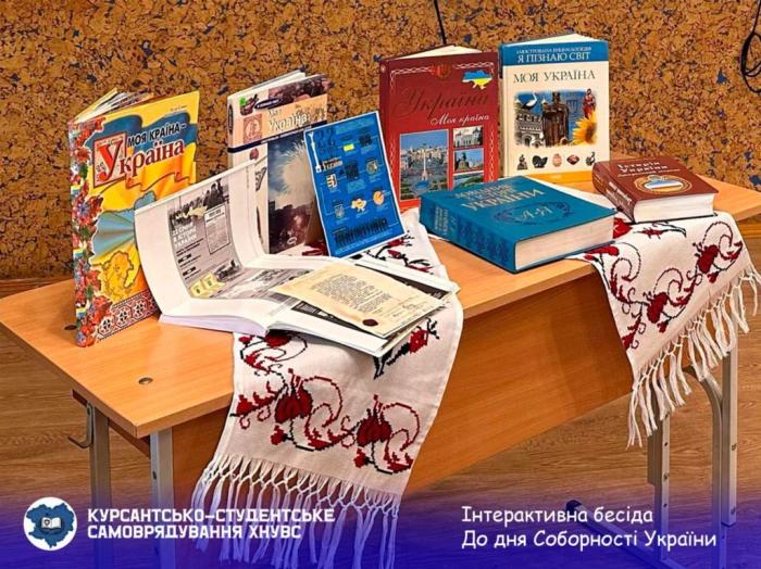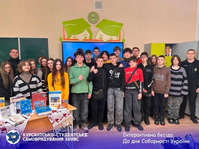 Representatives of the Cadet Council of the Educational and Research Institute No.4 held an interactive conversation with schoolchildren dedicated to the Day of the Unity of Ukraine. The event was aimed at deepening students' knowledge about the historical background for the unification of Ukrainian lands, the significance of the Act of Unification of 1919. https://univd.edu.ua/uk/news/26468