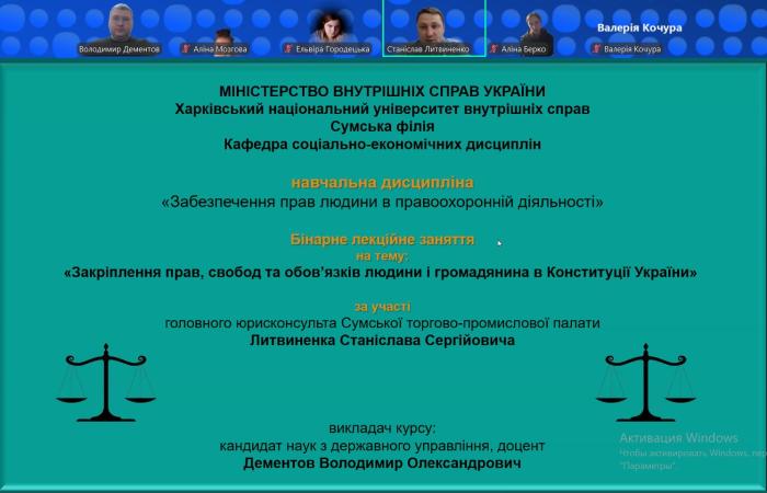 У межах вивчення дисципліни «Юридична психологія» доцентка кафедри гуманітарних дисциплін Сумської філії ХНУВС Надія ДЕМИДЕНКО провела онлайн-заняття на тему «Психологічна допомога від наслідків війни» для студентів 2 курсу, які навчаються за спеціальністю «Право».