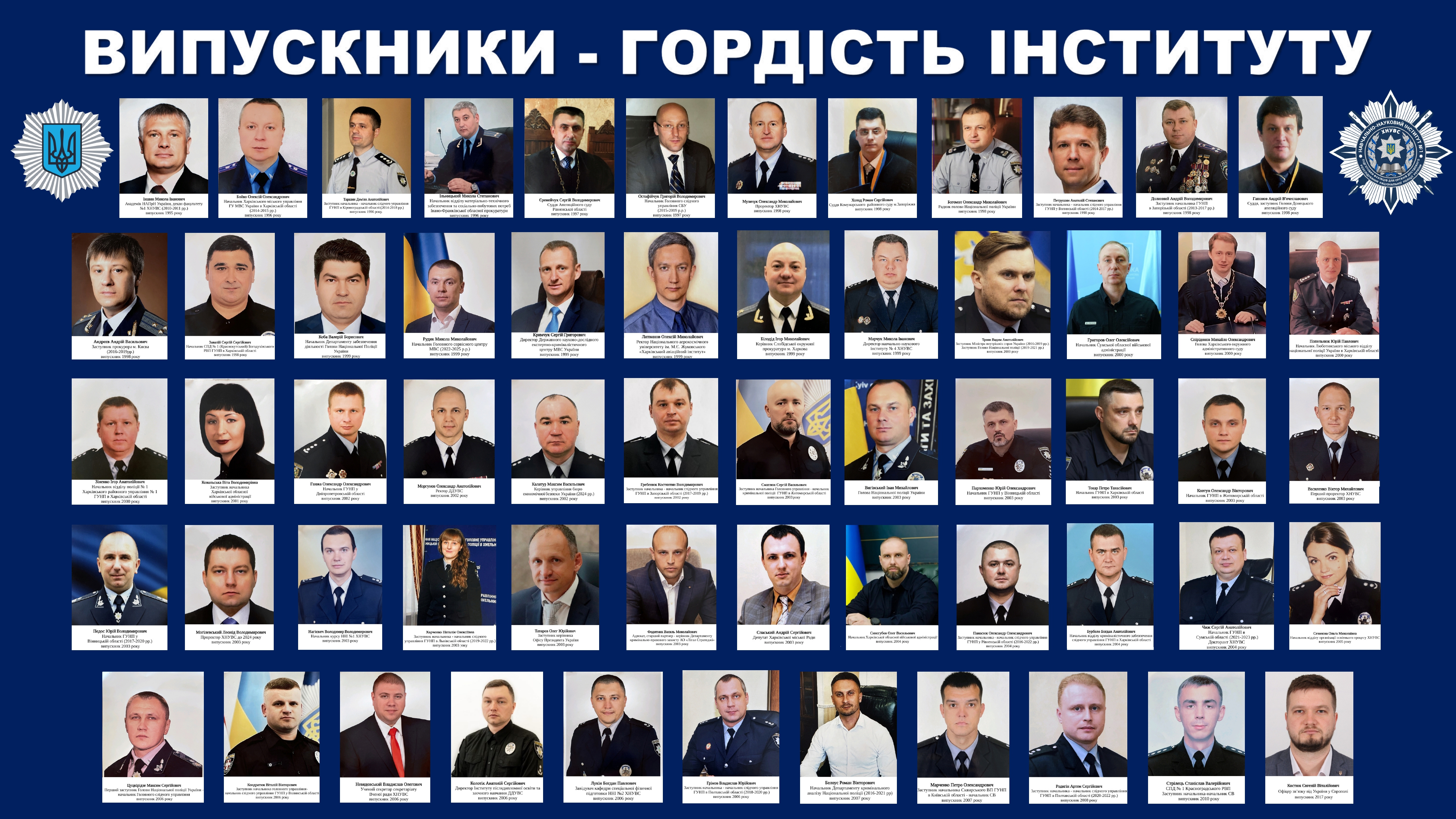 За роки функціонування інституту з його стін вийшло понад 6700 випускників, які сьогодні успішно працюють на посадах дізнавачів, слідчих, прокурорів, суддів та інших посадах, пов’язаних із юриспруденцією і не тільки, в різних регіонах України. Значна їх кількість займає керівні посади в лавах Національної поліції України та інших органах державної влади. Фотокартки найуспішніших випускників інституту розміщено на дошці «Випускники – гордість інституту». Здобутки інституту й Університету високо оцінені керівництвом Міністерства внутрішніх справ України та Національної поліції.