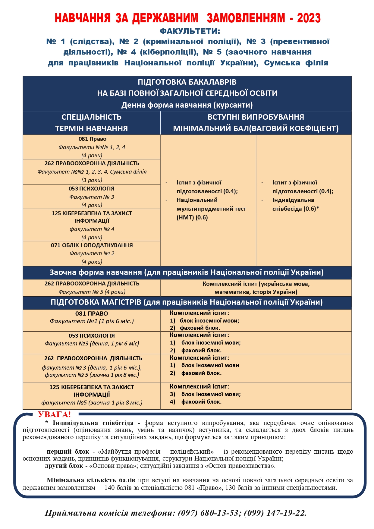 Рівень фізичної підготовленості вступників за державним замовленням оцінюється відповідно до вправ та нормативів, визначених у таблиці нормативів з фізичної підготовки кандидатів на навчання та визначається за результатами виконання двох контрольних вправ: