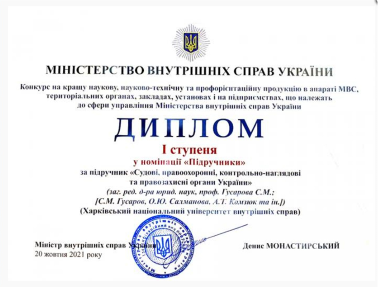 Так, у 2021 році підручник «Судові, правоохоронні, контрольно-наглядові та правозахисні органи України»: [С.М. Гусаров, О.Ю. Салманова, А.Т. Комзюк та ін.] за заг. ред. доктора юридичних наук, професора С.М. Гусарова» за результатами щорічного конкурсу на кращу наукову, науково-технічну та профорієнтаційну продукцію в апараті МВС, територіальних органах, закладах, установах і на підприємствах, що належать до сфери управління МВС України нагороджено Дипломом І ступеня у номінації «Підручники».