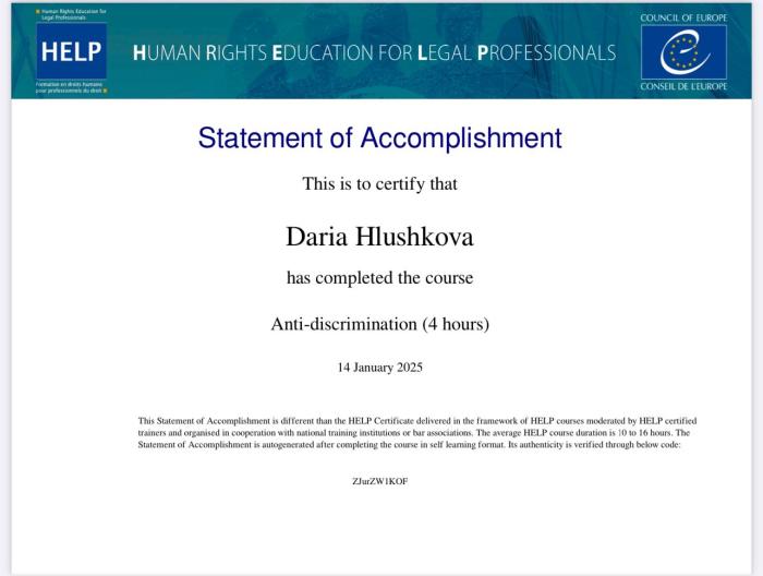 Гарант освітньо-професійної програми першого (бакалаврського) рівня вищої освіти, галузь знань 26 «Цивільна безпека», спеціальність 262 «Правоохоронна діяльність» (правоохоронна діяльність), професорка кафедри правоохоронної діяльності ННІ №5 Олена Синявська та доцентка цієї ж кафедри Дар’я Глушкова разом зі студентками Іриною Лотоцькою, Веронікою Жолтіковою, Дар’єю Муратовою, які здобувають вищу освіту за освітньою програмою першого (бакалаврського) рівня вищої освіти «Правоохоронна діяльність», успішно пройшли курс «Anti-discrimination» від Ради Європи. Курс, який розроблено спеціально для юристів, складається з чотирьох модулів: «Дискримінація щодо осіб з інвалідністю», «Дискримінація за ознакою раси, релігійної приналежності та ін.», «Дискримінація за ознаками сексуальної орієнтації та гендерної ідентичності» та «Дискримінація по відношенню до ромів». Курс містить багато покликань на сучасне законодавство й прецедентне право ЄС і Ради Європи.