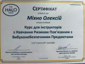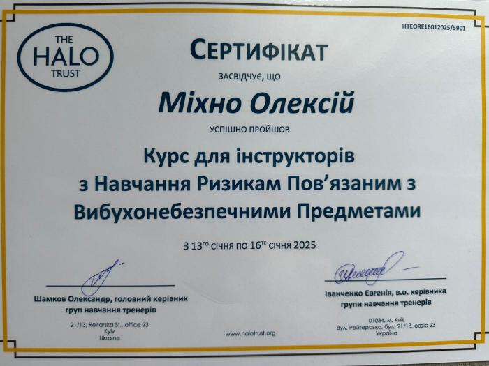 Провідний фахівець ННІ №2 Олексій Міхно пройшов навчальний курс «Підготовка інструкторів з навчанням ризикам, пов’язаним з вибухонебезпечними предметами», проведений міжнародним оператором протимінної діяльності, сертифікованим в Україні у сфері освітньої діяльності, The Halo Trust в Україні.