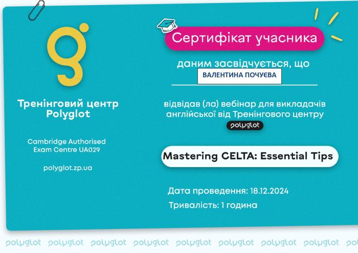 Науково-педагогічні працівники кафедри мовної підготовки ХНУВС – завідувачка кафедри Олена Статівка, професор Олег Гончарук, доцентки Валентина Почуєва та Валентина Кочина, старші викладачі Лариса Сазанова та Артем Білоусов – взяли участь у міжнародному онлайн-вебінарі для викладачів англійської від Тренінгового центру Polyglot «Mastering CELTA: Essential Tips». Під час заходу вони ознайомилися з умовами проходження інтенсивного курсу CELTA (Certificate in English Language Teaching to Adults) та порадами щодо підготовки до нього.