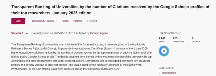 Опубліковано 9-е видання Рейтингу університетів, що базується на кількості цитувань найпопулярніших профілів науковців у Google Scholar (Top Universities by Citations in Top Google Scholar profiles, January 2025). Рейтинг охоплює понад 6100 закладів вищої освіти, ранжованих за кількістю цитувань, отриманих провідними вченими у їхніх публічних профілях Googler Scholar. Дані отримані за допомогою фільтрації за вебдоменом університету 310 найпопулярніших профілів за цитуванням. Для забезпечення репрезентативності найкращі 20 профілів зі списку було вилучено. Університети ранжуються у порядку спадання показника – кількість цитувань.