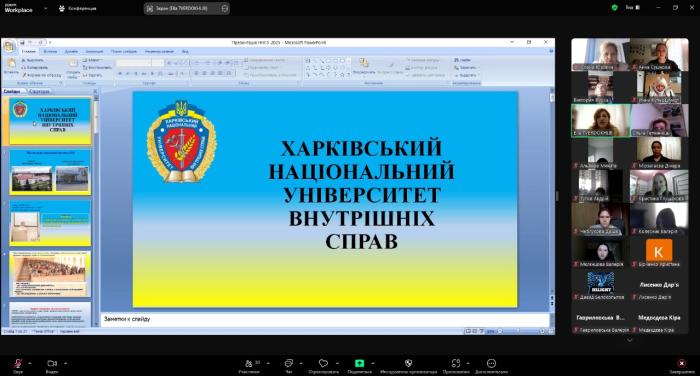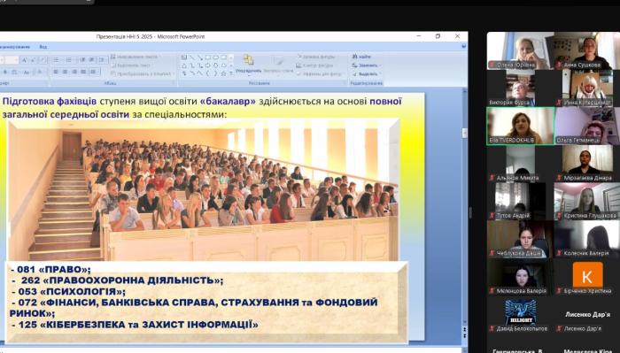 За участі керівництва ННІ №5 – директорки Оксани Брусакової та її заступниці Елли Твердохліб – представники кафедри правового забезпечення підприємницької діяльності та фінансової безпеки провели профорієнтаційну онлайн-зустріч із учнями випускних класів Харківського ліцею №70 Харківської міської ради. Вони ознайомили молодь із перевагами навчання у ХНУВС, спеціальностями, за якими готують фахівців і перспективами подальшого працевлаштування, а також розповіли про роботу підготовчого відділення.