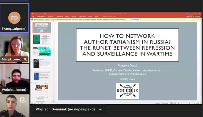 Учасників привітав проректор з міжнародних питань Університету імені Адама Міцкевича у Познані Рафал Вітковський, який висловив слова підтримки українським учасникам лекції та представив лекторку Франсуазу Доке, яка є професоркою Школи вищих досліджень соціальних наук (EHESS) у Парижі. Вона виступила з доповіддю «Як створити мережу авторитаризму в росії? Рунет між репресіями та наглядом у воєнний час».