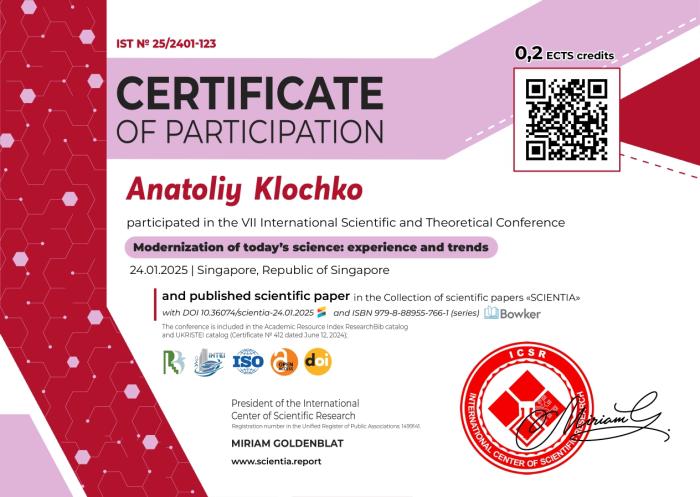 Завідувач кафедри гуманітарних дисциплін та українознавства, доктор історичних наук, професор, заслужений працівник освіти України Володимир Греченко та помічник ректора, доктор юридичних наук, професор Анатолій Клочко дистанційно взяли участь у VII Міжнародній науково-практичній конференції «Модернізація сучасної науки: досвід і тенденції» («Modernization of today’s science: experience and trends»), що відбулася у місті Сінгапурі (Республіка Сінгапур). Науковці подали доповідь, присвячену взаємодії правоохоронних органів і громадських організацій у боротьбі зі злочинністю в історичному аспекті. Робота конференції відбувалася у 30 секціях, у ній взяли участь 142 вчених із різних країн світу.