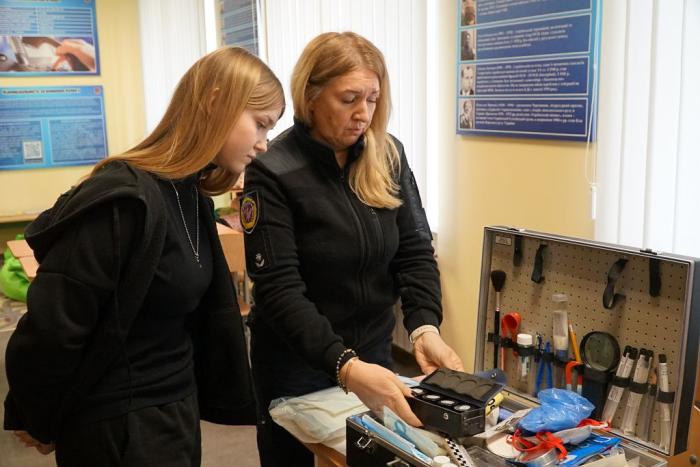 Доцентка кафедри криміналістики та судової експертології Олена Макарова ознайомила школярів із роботою криміналіста та продемонструвала вміст його валізи, призначеної для виявлення і збору речових доказів на місці злочину для подальшого проведення експертиз і досліджень.