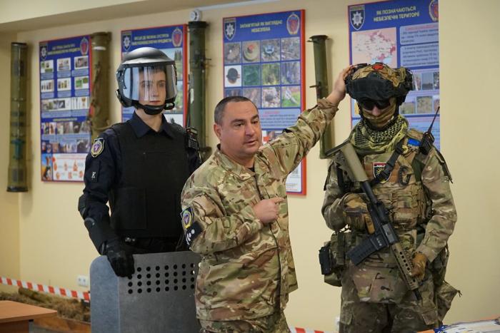 Доцент кафедри з вогневої підготовки Максим Владимиров і старший викладач кафедри тактико-спеціальної підготовки Володимир Євтушок разом із курсантами продемонстрували макети різних видів зброї, вибухонебезпечних предметів і боєприпасів, а також екіпірування поліцейського під час виконання спеціальних завдань.
