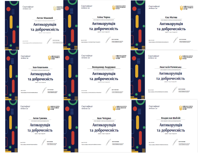 Представники кафедри адміністративної діяльності ННІ №3 – завідувачка Олена ДЖАФАРОВА, професор Віталій ПЧЕЛІН, доцентка Наталія ГРІДІНА та курсанти ННІ №3 завершили онлайн-навчання «Антикорупція та доброчесність» на платформі «Study.nazk». Освітня програма охоплювала теоретичні та практичні аспекти, зокрема поняття побутової корупції, її прояви та наслідки. Учасники вивчили методи підвищення ефективності навчання, такі як створення вікторин на платформі Kahoot, а також обговорили етичні дилеми за методикою «Світове кафе». Акцент було зроблено на опрацюванні механізмів запобігання корупції та впровадженню організаційних, правових та освітніх заходів, що дозволило учасникам курсу не лише зрозуміти основні засади запобігання та протидії корупції, а й сформувати конкретні навички для реалізації цих принципів у своїй професійній діяльності.