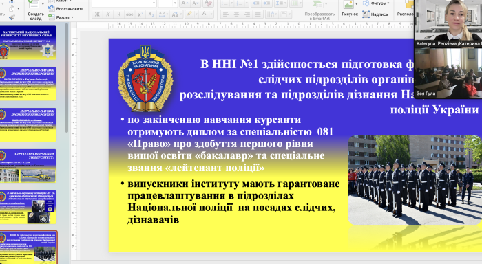 Старша викладачка кафедри криміналістики та судової експертології ННІ №1 Катерина ПЕНЗЄВА провела онлайн-зустріч з учнями Ходоровецького ліцею Кам’янець-Подільської міської ради Хмельницької області. Вона розповіла молоді про освітні можливості університету, зокрема навчально-наукові інститути, спеціальності, умови навчання, життя та дозвілля курсантів і студентів. Майбутні абітурієнти дізналися про переваги навчання в ХНУВС, можливості для розвитку в науці, творчості та спорті, а також про перспективи працевлаштування та кар'єрного росту після закінчення університету.