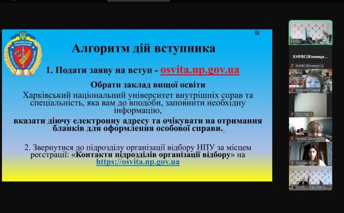 Помічник ректора ХНУВС Віктор СЛИШ спільно з представниками ННІ №1 та відділу профорієнтаційної роботи провели онлайн-зустріч із випускниками шкіл Тернопільської, Хмельницької, Чернівецької, Луганської областей та м. Харкова. До заходу приєдналося понад 700 випускників на 518 локаціях.