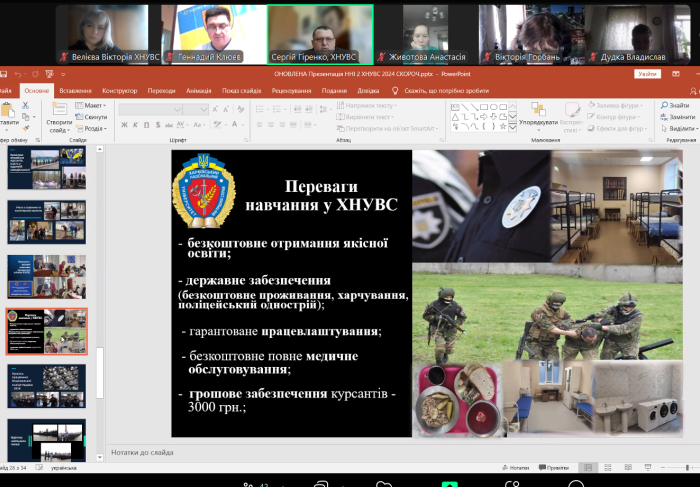 Із ліцеїстами дистанційно поспілкувалися заступник директора з освітньої та науково-дослідної діяльності ННІ №2 Сергій ГІРЕНКО, завідувачка кафедри соціальних та економічних дисциплін професор Ірина СЄВІДОВА та доцентка цієї ж кафедри Вікторія ВЕЛІЄВА. Вони ознайомили присутніх з особливостями вступу до ХНУВС, значними перевагами навчання в університеті, його навчально-науковими інститутами та спеціальностями. Особливу увагу було приділено вступу до навчально-наукового інституту №2 на спеціальність 071 «Облік і оподаткування (облікова аналітика)». Вчителі та учні отримали вичерпні відповіді щодо умов вступу, наукового та спортивного життя в університеті, а також перспектив працевлаштування.