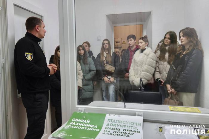 Поліцейські також ознайомили студентів із кімнатами для затриманих і побачень, розповіли про переваги відеофіксації та електронного реєстру, а також про особливості роботи інспектора з дотримання прав людини.