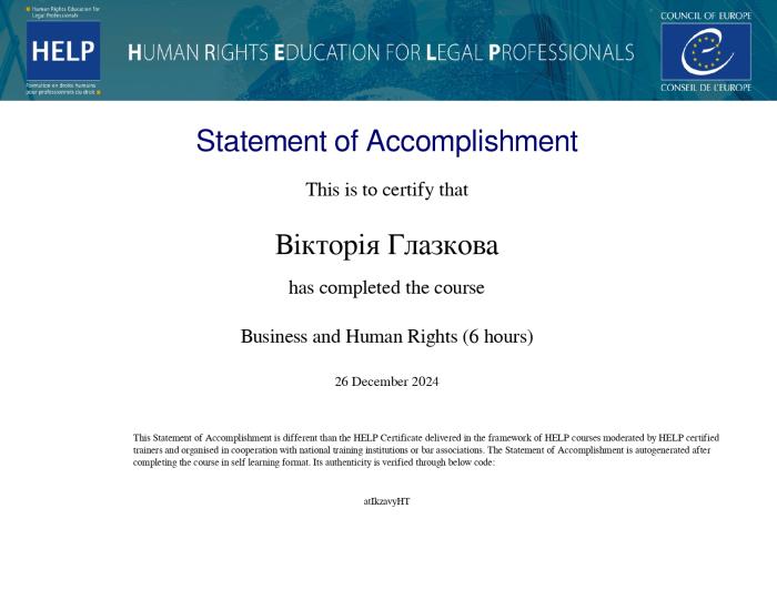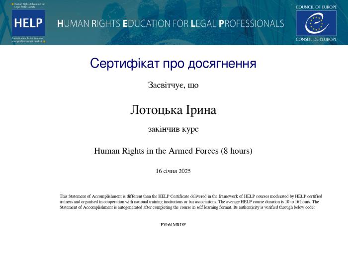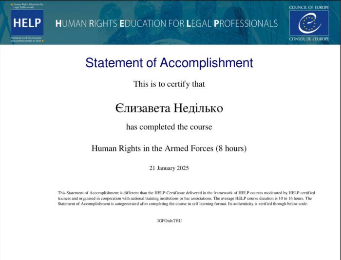 За такою темою завідувач кафедри цивільного права та процесу ННІ №5, професор Юрій ЖОРНОКУЙ та старша викладачка кафедри Софія ПОПОВА разом зі студентами пройшли курс підвищення кваліфікації на онлайн-платформі HELP, зокрема англійською мовою (Human Rights in the Armed Forces, Business and Human Right).