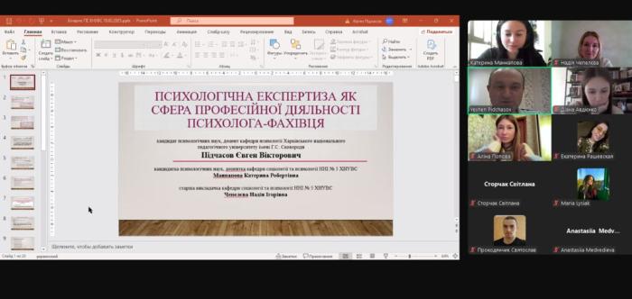 Доцентка кафедри соціології та психології ННІ № 5 Катерина МАННАПОВА, старша викладачка цієї ж кафедри Надія ЧЕПЕЛЄВА провели для студентів 4 курсу бінарне заняття за участю доцента кафедри психології Харківського національного педагогічного університету імені Г.С. Сковороди Євгена ПІДЧАСОВА.