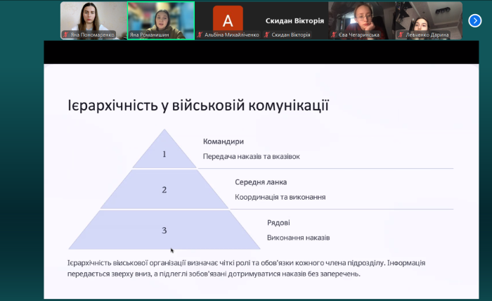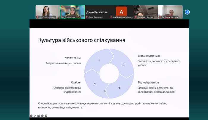 За ініціативи доцентки кафедри соціології та психології ННІ№5, кандидатки психологічних наук, доцентки Яни ПОНОМАРЕНКО відбулося онлайн-заняття з дисципліни «Культура професійного спілкування» для студентів-психологів ННІ№5 на тему «Особливості спілкування з військовослужбовцями».