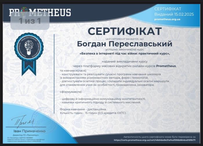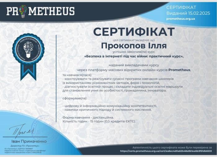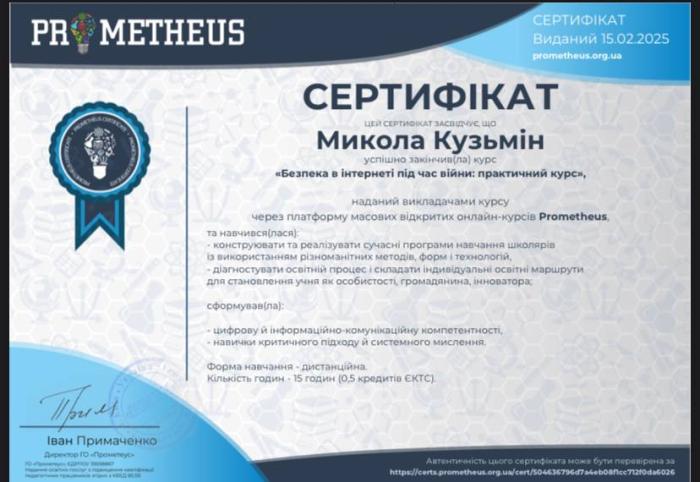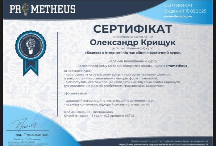За такою темою доцентка кафедри кримінального права і кримінології ННІ №1, кураторка Тетяна ШЕВЧУК ініціювала проходження курсантами освітньої програми. Мета – сформувати вміння, необхідні для критичного сприйняття інформаційного простору, безпечного використання сучасних технологій та ефективного оперування цифровими інструментами, зокрема соцмережами. У програму увійшло опрацювання трьох модулів: «Інформаційна грамотність і безпека в інтернеті»; «Комунікація та безпечна взаємодія в цифровому суспільстві»; «Приватність і цифрове середовище»; «Потенційні ризики та інформаційна грамотність». Здобувачі освіти отримали знання та навички для забезпечення кібербезпеки, уникнення онлайн-шахрайства і збереження особистої інформації.