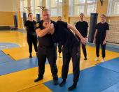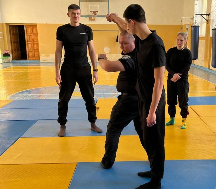 Викладач кафедри спеціальної фізичної підготовки ННІ №2 Олександр ШЕПЕЛЕВ і старший дільничний 4-го відділення поліції Тернопільського РУП ГУНП у Тернопільській області Дмитро МІНЬКО разом із курсантами ННІ №4 детально розібрали способи затримання правопорушника під час підходу спереду із загином руки за спину («ривком», «замком», «нирком»), виконання повалень супротивника, дестабілізацію голови тощо. Опрацювали також техніку надягання кайданок і проведення поверхневої перевірки особи після застосування фізичного впливу (сили).