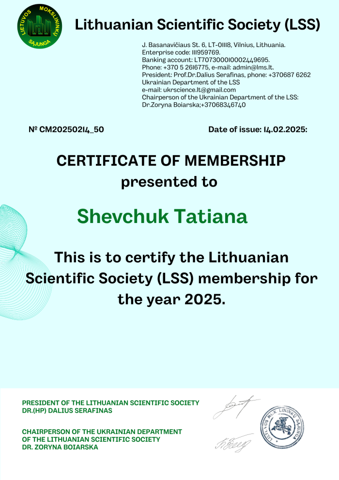Доцентка кафедри кримінального права і кримінології ННІ №1 Тетяна ШЕВЧУК за результатами міжнародного стажування за програмою «Передові практики та інновації у вищій освіті: міжнародний досвід Литви» та активної участі у наукових заходах, організованих Mokslininkų sąjungos institutas та Lietuvos mokslininkų sąjunga у партнерстві з ГО «Інкубатор демократичних ініціатив», стала дійсною членкинею Литовського наукового товариства.