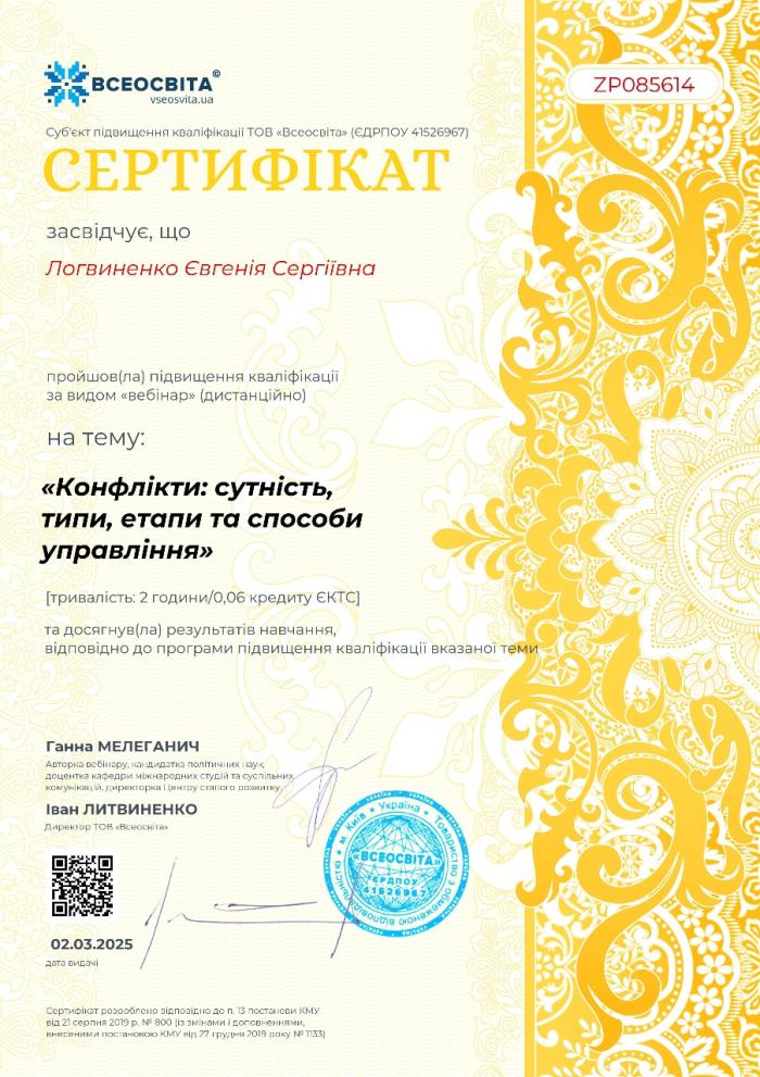 Професорка кафедри конституційного і міжнародного права та прав людини ХНУВС Євгенія ЛОГВИНЕНКО дистанційно взяла участь у вебінарі, присвяченому дослідженню конфліктів та їх врегулюванню. Спікеркою виступила доцентка Ужгородського національного університету, кандидатка політичних наук Ганна МЕЛЕГАНИЧ. Учасники обговорили ключові аспекти конфліктів, зокрема їхню природу, структуру, етапи розвитку та можливі моделі управління. Окрему увагу приділили питанням організаційних і соціальних конфліктів, а також механізмам їх ефективного розв’язання в умовах змін. Отримані знання дозволять розширити науковий дискурс щодо конфліктології у правовій площині, зокрема щодо застосування інструментів медіації та альтернативного вирішення спорів.