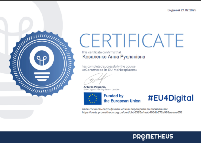 Старша викладачка кафедри правового забезпечення підприємницької діяльності та фінансової безпеки ННІ № 5 Ірина АНТОЛ та здобувачі вищої освіти кількох груп ННІ №5 (бакалаври й магістри), які навчаються за спеціальністю «Право», пройшли онлайн курс «Майданчики електронної комерції в ЄС» від Академії EU4Digital, розміщений на сайті Prometheus, та отримали відповідні сертифікати про успішне завершення навчання із зазначенням кількості годин щодо підвищення кваліфікації.