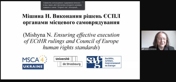Доповідачем виступила дослідниця індивідуального грантового проєкту «Роль органів місцевого самоврядування у виконанні постанов ЄСПЛ» у Страсбурзькому університеті, професорка кафедри конституційного права Національного університету «Одеська юридична академія», докторка юридичних наук, професорка Наталя МІШИНА, а також суддя Конституційного Суду України Галина ЮРОВСЬКА.