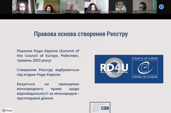 Студенти також дізналися про Реєстр збитків, його механізм, мету, правову основу та правила членства. Вони ознайомилися з категоріями заяв, які можна подати до Реєстру, алгоритмом їх подання та подальшими кроками, зокрема компенсаційним механізмом. Учасники заходу також обговорили значення Реєстру для України.