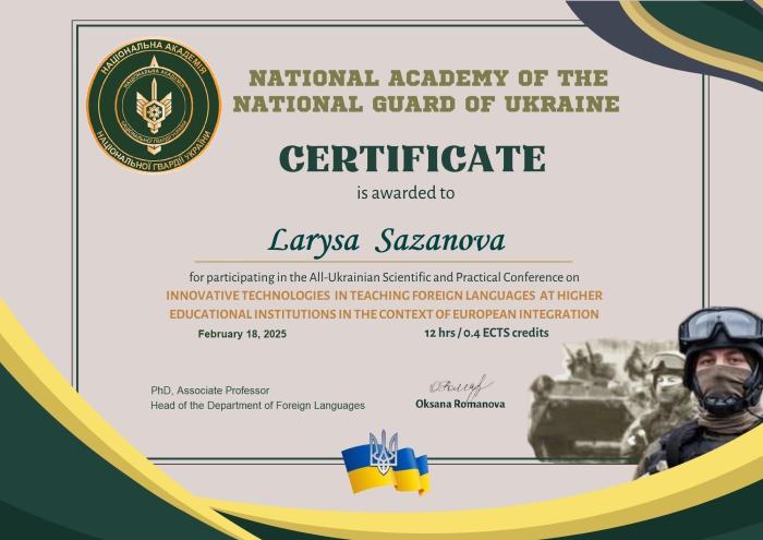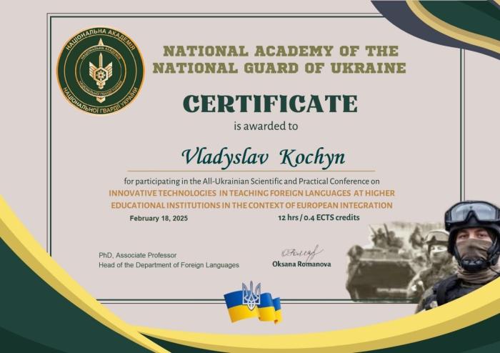 Науково-педагогічний склад кафедри мовної підготовки ХНУВС – професор кафедри Олег ГОНЧАРУК, доцентка Віта ФИЛИПСЬКА, старші викладачки Лариса САЗАНОВА, Наталія ОЛЕНДРА та курсант другого курсу ННІ №4 Владислав КОЧИН взяли участь у Всеукраїнській науково-практичній онлайн-конференції «Інноваційні технології навчання іншомовної підготовки у закладах вищої освіти в контексті європейської інтеграції» в Національній академії Національної гвардії України. Були представлені доповіді за такими темами: «Рекурентність у мультимодальних текстах», «Інтеграція сучасних міжнародних стандартів викладання іноземної мови у вищу освіту України», «Впровадження інформаційних технологій: досвід викладання іноземних мов»,«Використання інструментів штучного інтелекту під час викладання іноземних мов у закладах вищої освіти» та «Introducing Information Technologies: Experience of Teaching Foreign Languages». За результатами заходу було отримано збірку матеріалів конференції та сертифікати учасника (12 годин – 0.4 ECTS).