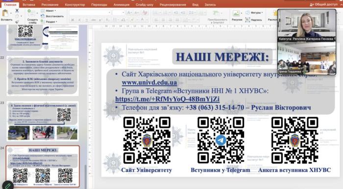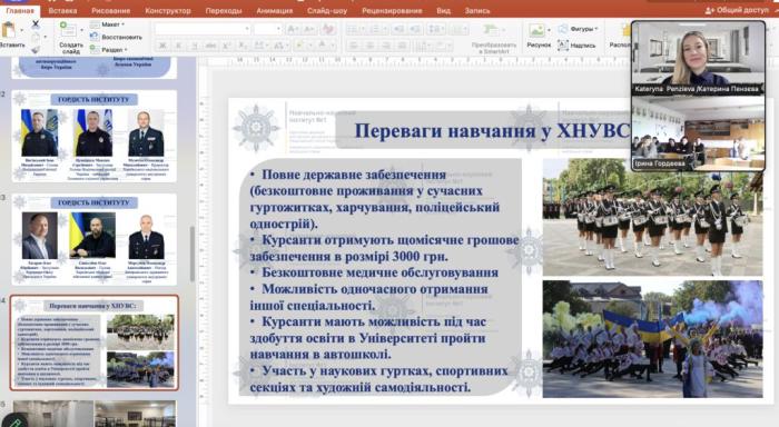 Викладачка наголосила на перспективах працевлаштування та кар'єрного росту після закінчення університету, надала інформацію про реєстрацію кандидатів на вступ до ХНУВС на порталі НПУ: https://osvita.np.gov.ua/.