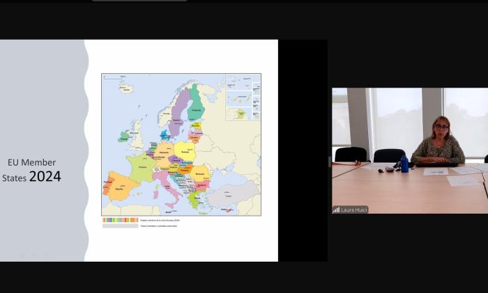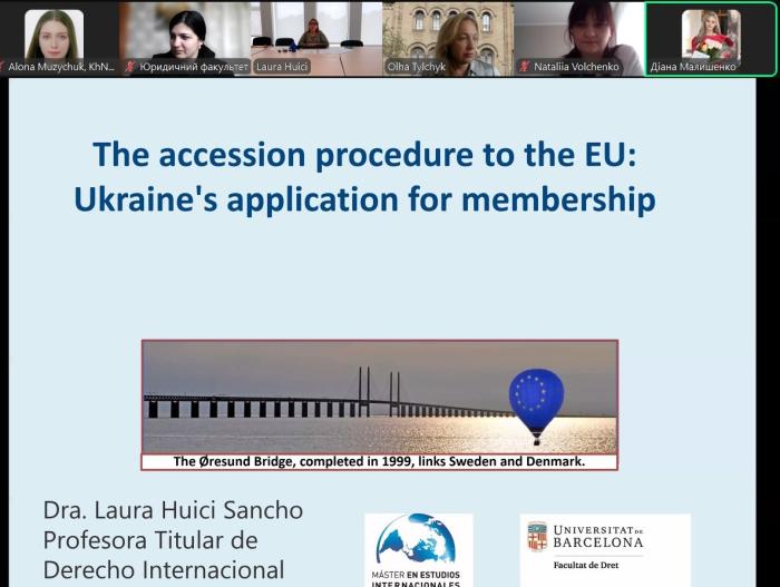 Науково-педагогічні працівники та здобувачі вищої освіти навчально-наукових інститутів №№1-5, Сумської філії та Кременчуцького льотного коледжу ХНУВС прослухали відкриту лекцію англійською мовою на тему «Членство в ЄС: Виклики до України». Її прочитала професорка міжнародного публічного права Інституту досліджень TransJus Барселонського університету (Institut de Recerca TransJus, Universidad de Barcelona), докторка юридичних наук Лаури Хуічі САНЧО. Освітній захід став третім у серії вебінарів, спрямованих на підтримку академічного та освітнього досвіду для студентів і дослідників в Україні.