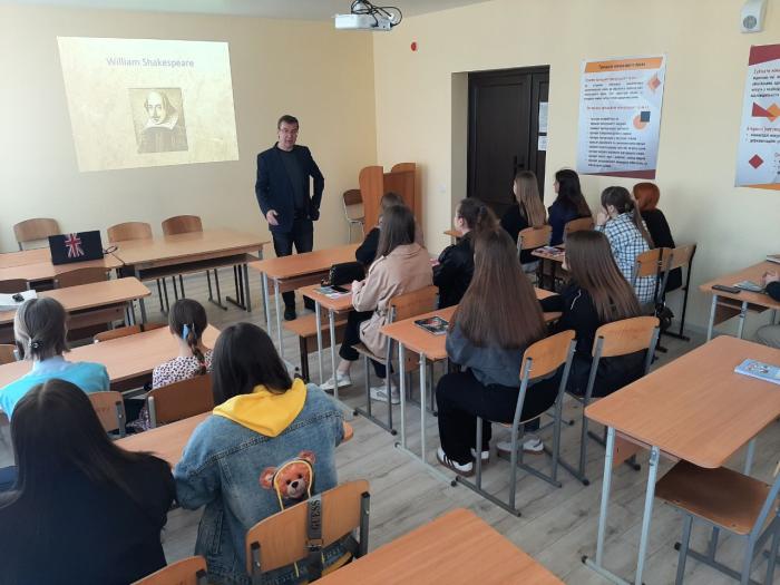 Студенти ознайомилися з біографією та творчим шляхом цієї великої постаті. Його п’єси, такі як «Romeo and Juliet», «Hamlet», «Othello», «King Lear», вражають читачів своєю глибиною, емоційністю та майстерністю слова.