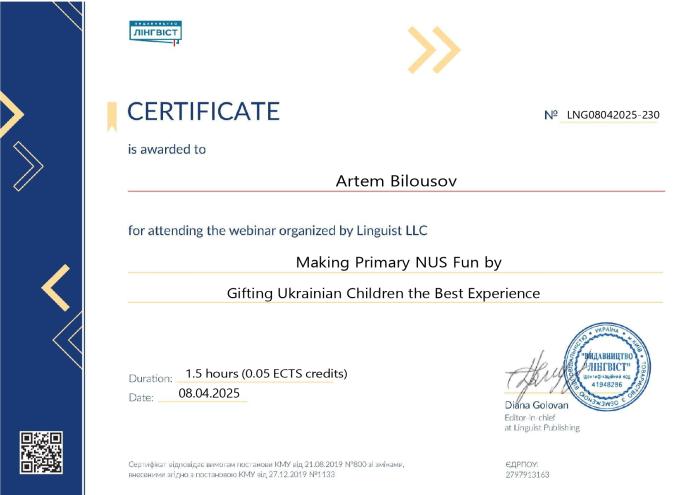 Старший викладач цієї ж кафедри Артем БІЛОУСОВ долучився до Міжнародного онлайн-вебінару «Making Primary NUS Fun by Gifting Ukrainian Children the Best Experience», на якому ознайомився із способами диференціації навчання: як враховувати потреби кожного та допомагати тим, хто навчається досягати успіху. Учасникам вебінару продемонстрували також новинки видавництва для проведення цікавих занять.