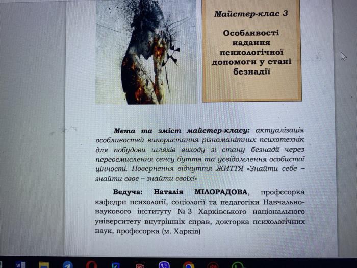 Професорка кафедри психології, соціології та педагогіки ННІ №3, докторка психологічних наук Наталя МІЛОРАДОВА провела майстер-клас на тему «Особливості надання психологічної допомоги у стані безнадії». Його мета – актуалізація особливостей використання різноманітних психотехнік для побудови шляхів виходу зі стану безнадії через переосмислення сенсу буття та усвідомлення особистої цінності.