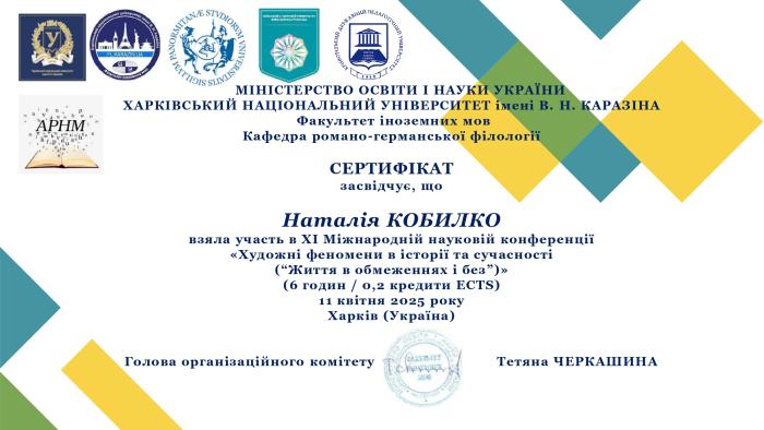 Доцентка кафедри гуманітарних дисциплін та українознавства, кандидатка філологічних наук Наталія КОБИЛКО і професор кафедри мовної підготовки, кандидат філологічних наук Олег ГОНЧАРУК дистанційно долучилися до роботи ХІ Міжнародної наукової конференції «Художні феномени в історії та сучасності (“Життя в обмеженнях і без”)», яка відбулася в Харківському національному університеті імені В. Н. Каразіна. Захід проходив у режимі онлайн на платформі Zoom та об’єднав учених із різних куточків України, а також Угорщини, Сербії, Польщі, Канади, Франції, Італії, Словаччини. У своїх доповідях науковці розкрили теми межі та безмежності, поневолення та свободи, нормальності й анормальності, бар’єрності й безбар’єрності. Полем досліджень стали різножанрові твори як класиків, так і сучасних авторів.