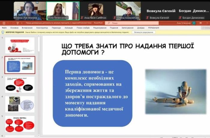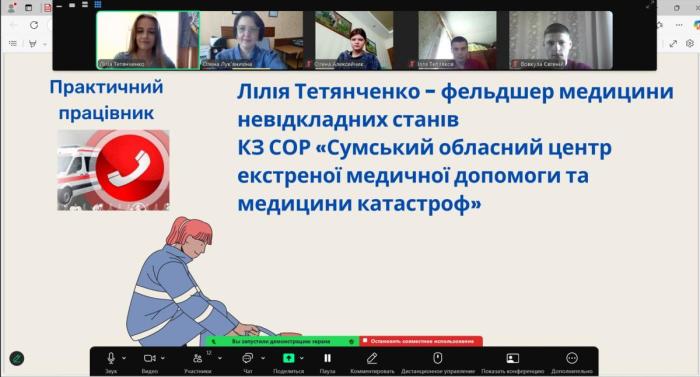 З метою забезпечення практико-орієнтованої підготовки здобувачів освіти, які навчаються за спеціальністю «Правоохоронна діяльність», було проведено онлайн-заняття за участі фельдшерки медицини невідкладних станів КЗ СОР «Сумський обласний центр екстреної медичної допомоги та медицини катастроф» Лілії ТЕТЯНЧЕНКО. Тема – «Надання першої домедичної допомоги потерпілим у життєвих, надзвичайних ситуаціях та на виробництві».
