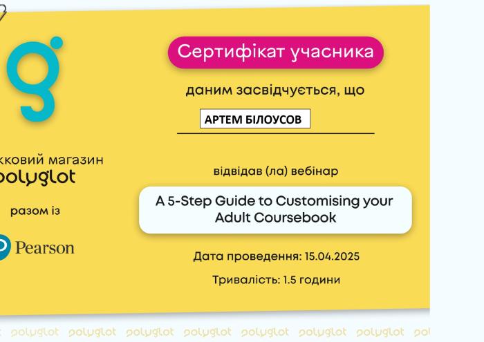Науково-педагогічний склад кафедри мовної підготовки ХНУВС – завідувачка кафедри Олена СТАТІВКА, професор Олег ГОНЧАРУК, доцентки Валентина ПОЧУЄВА та Валентина КОЧИНА, старші викладачі Лариса САЗАНОВА та Артем БІЛОУСОВ – відвідали Міжнародний онлайн-вебінар «A 5-Step Guide to Customising your Adult Coursebook» від компанії Pearson. Викладачі отримали корисну інформацію про нові навчальні підручники з англійської мови для дорослих, матеріал яких може бути успішно використано під час проведення практичних занять із здобувачами освіти в межах дисципліни «Іноземна мова професійного спрямування».