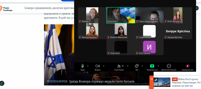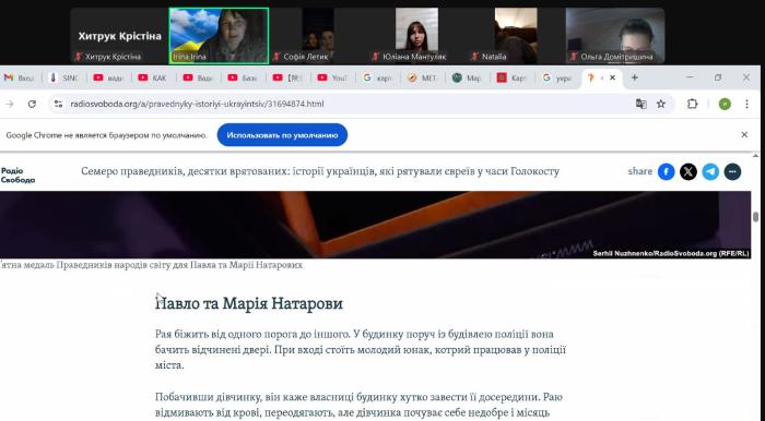 Кураторка, доцентка кафедри правового забезпечення підприємницької діяльності та фінансової безпеки ННІ №5 Ірина КИРЄЄВА провела кураторську годину зі студентами з нагоди вшанування подвигу українців. Цей день пам’яті щороку відзначається 14 травня. Людей, які, ризикуючи власним життям, переховували євреїв, зберігаючи їм життя, у світі називають Праведниками народів світу. За кількістю Праведників Україна посідає четверте місце у світі після Польщі, Нідерландів і Франції. Імена цих героїв увічнені на стінах меморіального комплексу «Яд Вашем» у Єрусалимі.
