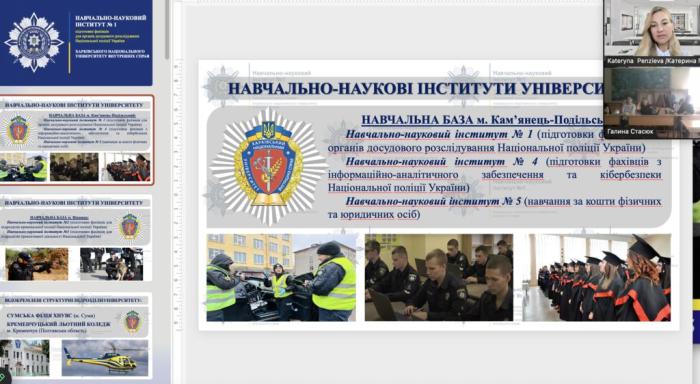 Під час зустріч зі старшокласниками Довжоцького ліцею Кам’янець-Подільської міської ради Хмельницької області старша викладачка кафедри Катерина ПЕНЗЄВА розповіла про навчально-наукові інститути та спеціальності, за якими готують фахівців у ХНУВС, про умови навчання, побуту та дозвілля курсантів і студентів. Особливу увагу викладачка звернула на особливості підготовки спеціалістів органів досудового розслідування. Вона ознайомила майбутніх абітурієнтів із перевагами навчання у виші, можливістю пройти курси у безбар’єрній автошколі ХНУВС на отримання посвідчення водія категорії «В».