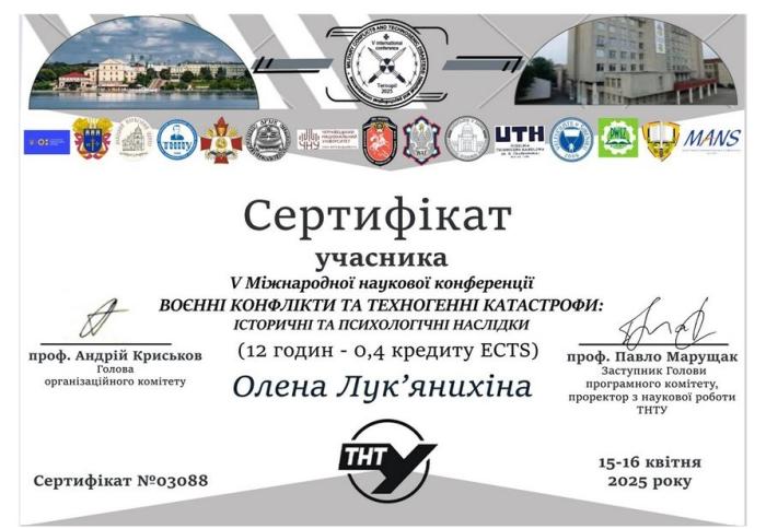 Професорка кафедри соціально-економічних дисциплін Олена ЛУК’ЯНИХІНА разом зі студенткою 1 курсу Єлизаветою Коваленко дистанційно долучилися до роботи IV Міжнародної науково-практичної конференції «Воєнні конфлікти та техногенні катастрофи: історичні та психологічні наслідки», організованої Тернопільським національним технічним університетом імені Івана Пулюя.