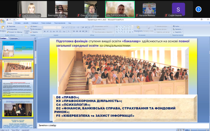 Заступниця директорки Елла ТВЕРДОХЛІБ учасникам зустрічі презентувала Харківський національний університет внутрішніх справ, розповіла про умови вступу, про навчально-наукові інститути та спеціальності, за якими готують фахівців вишу, про особливості навчання, зокрема у ННІ №5.