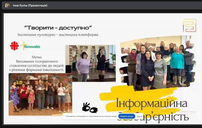 Учасники вебінару ознайомилися з основними напрямами діяльності громадських ініціатив і державних інституцій, спрямованими на створення фізичної, інформаційної, освітньої та соціальної безбар’єрності. Під час жвавої дискусії присутні дійшли спільного висновку, що безбар’єрність – це не лише про фізичну доступність інфраструктури. Це комплексне поняття, яке стосується кожного, адже йдеться про рівність, повагу та можливість бути почутим. Політика безбар’єрності навчає бачити в кожній людині насамперед особистість – унікальну, з різною зовнішністю, статтю, віком, фізичними особливостями, але рівну в правах і можливостях.