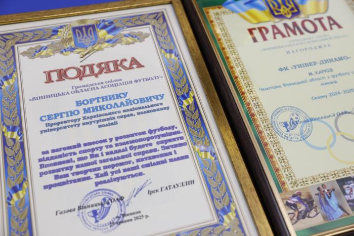 За вагомий внесок у розвиток футболу, відданість спорту та взаємопорозуміння ректор Валерій СОКУРЕНКО та проректор, голова правління ФСК «Універ-Динамо» Сергій БОРТНИК отримали Подяки від Вінницької обласної асоціації футболу, футбольний м’яч і спортивну форму для гравців команди.