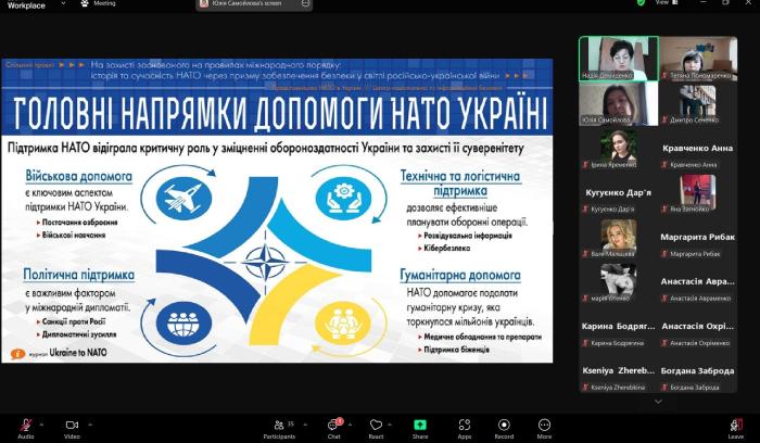 Юлія САМОЙЛОВА та Тетяна ПОНОМАРЕНКО зосередили увагу на цікавих фактах про НАТО та цінностях, що лежать в основі трансатлантичного партнерства. Вони підкреслили, що з початком повномасштабного вторгнення росії взаємодія між Україною і Північноатлантичним альянсом набула нового значення. НАТО рішуче засудив агресію рф і надає постійну, всебічну допомогу Збройним Силам України та цивільному населенню, вкрай важливо для гідної відсічі агресору.
