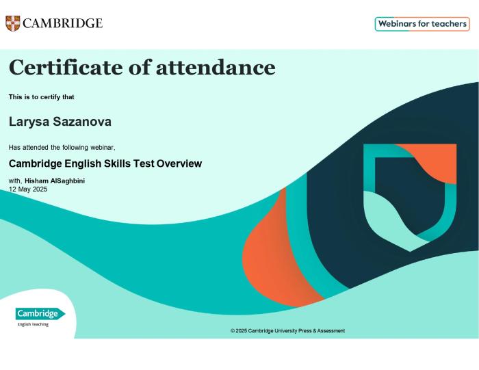 Викладачі кафедри ознайомилися із ключовими особливостями, перевагами та застосуванням трьох версій Кембриджського онлайн-тесту: English Skills Test (Schools) для школярів, English Skills Test (General) загальна англійська (вікова категорія 16+), English Skills Test (Business) ділова англійська мова (вікова категорія 16+) рівні від A1 до C1 за шкалою Загальноєвропейських рекомендацій з мовної освіти. Модульне тестування онлайн допомагає покращити знання та швидко отримати точні результати володіння англійською мовою.